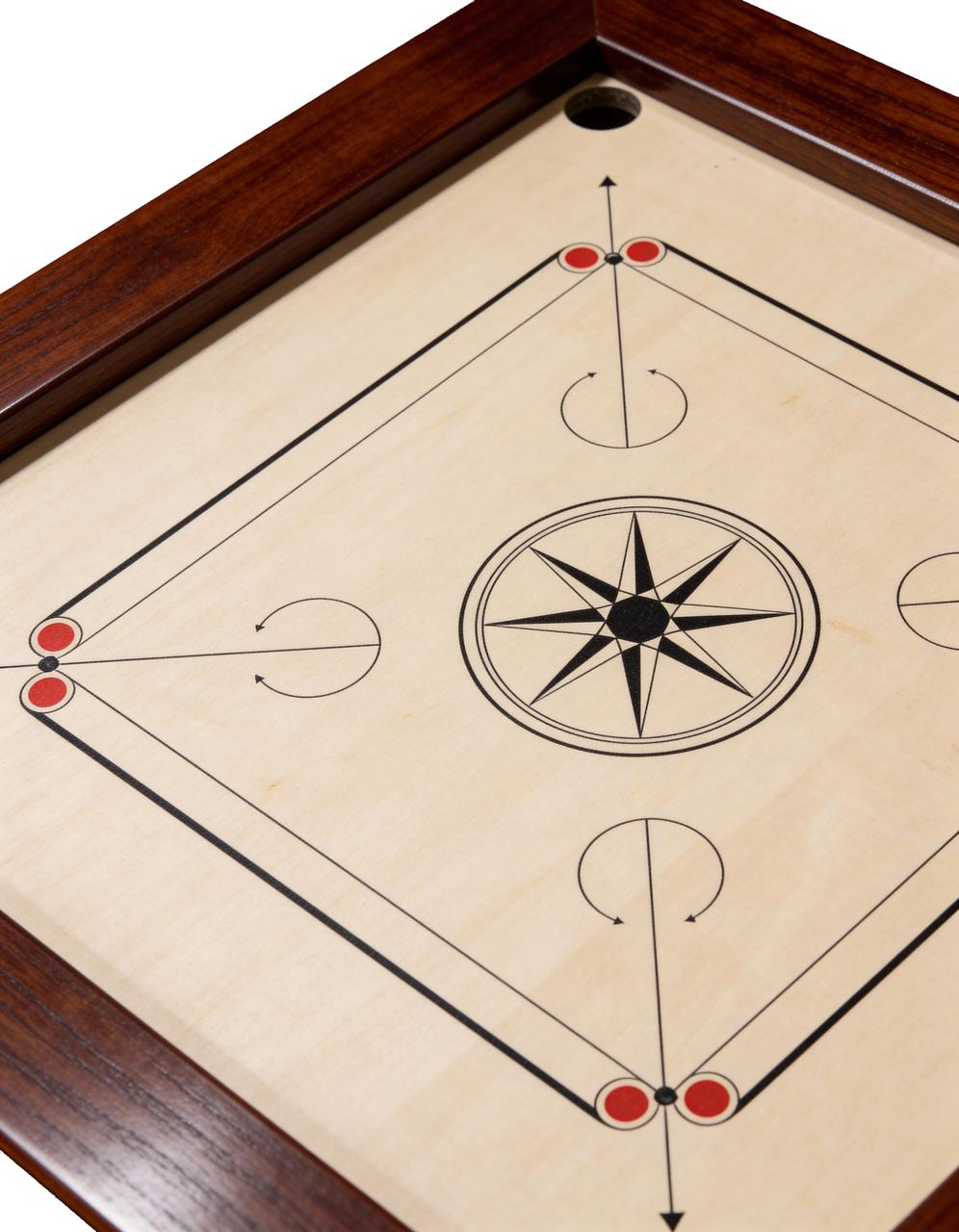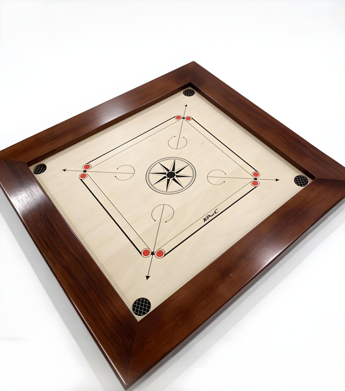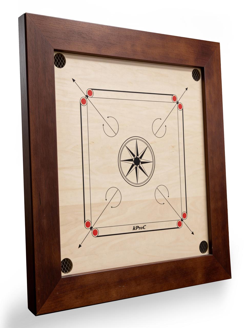 KProC Carrom Board made of Birch and Bine wood, Birch a slender hardy tree which has thin peeling bark and bears catkins. Birch trees grow chiefly in northern temperate regions and yield hard, pale, fine-grained timber. Bine wood used for board frame